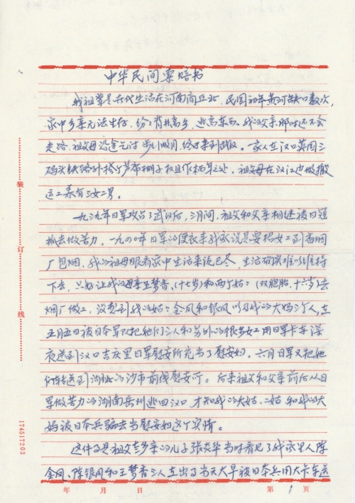 我祖辈是世代生活在河南商丘北,民国初年黄河缺口数次,家中乡亲无法生存,纷纷背井离乡,逃离东西。我的父亲那时还不会走路,祖父母沿途乞讨步行数月,终于来到武汉。一家人在汉口英国三码头铁路外搭个芦席棚子,权且作栖身之处。祖父母在汉江边做搬运工养有三女二男。