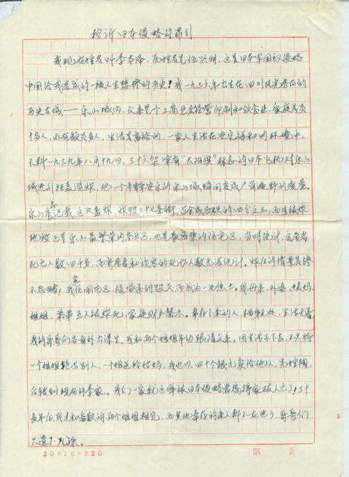 日本军国主义发动的侵华战争结束已四十九年了,但日本侵华战争给中国人民造成的深重灾难是永远忘不了的!根据《雅尔塔协议》、《开罗宣言》、《波茨坦公告》等一系列国际法文件……,发动侵略战争的战败国必须承担受害国人民一切损失的赔偿……。按国际法精神,我代表我们受害的全家及亲属特呈书向日本国政府提出受害赔偿要求!情况如下: