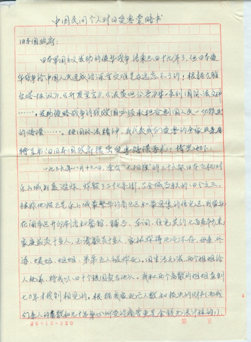 中国民间个人对日受害索赔书