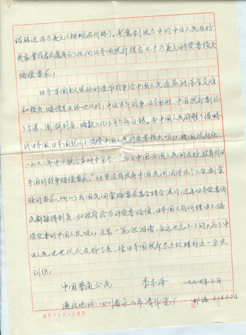 日本军国主义发动的侵华战争给中国人民造成的深重灾难和损失,赔偿是天经地义的!中日甲午战争,日本取胜,中国政府割让了台湾、澎湖列岛,赔款二亿三千万两白银。而中国人民战胜了侵略的日本国,日本国就可不赔偿中国人民的受害损失吗?!我国政府在一九七二年中日联合声明中宣布:“为了中日两国人民的友好,放弃对日本国的战争赔偿要求。”但并没有放弃中国民间团体及个人受割索赔的要求,所以我国民间索赔要求是合理合法的!近年日本受害侨民都能得到美、加政府给[予]的受害赔偿,日本国又有何理由不赔偿受害的中国人民呢?这是一笔血泪债,永远也忘不了的!为了中日人民世世代代友好下去,望日本国政府尽力处理好这一历史创伤!