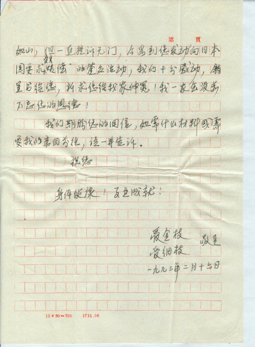 我们在报刊上看到了一些有关“向日本国要求受害赔偿”问题的文章和报道,对您的强烈的民族责任心及历史使命感,深为感动。我们相信通过您的艰苦努力和中国广大民众的拥护和支持,向日本国讨公道这一义举,必定会成功的。