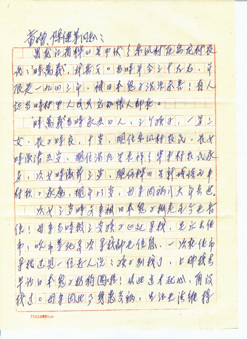 次女三岁时父亲被日本鬼子抓走至今无音信!母亲当时报三岁孩子四处寻找,先后去佳市,哈市等地多次寻找都无信息,一次在佳市寻找遇见一位老人说:孩子别找了,上[哪]找去,早让日本鬼子扔狗圈啦!从此这才死心,就没找过。母亲因此事身患多病,生活无法维持将三岁孩子送人,后又被我大爷要回并说:生一块!死一块!就这样母亲领我们三孩子度日后实在无法生活下去,被迫母亲改嫁“吴广山”。