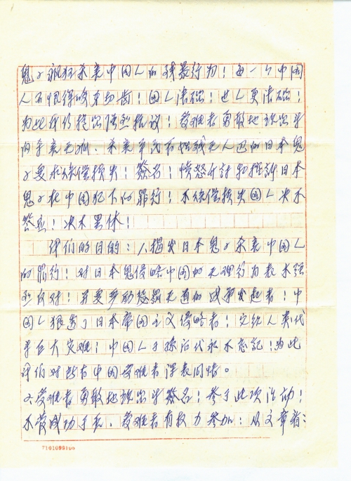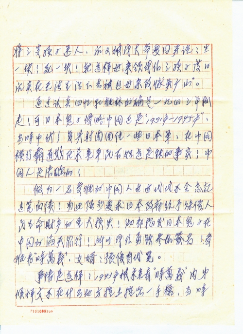 我看到:读者文摘92年月刊第十期第46-48页,古今纵横,历史没有忘记——国人向日本要求受害赔偿记实,“李佩钰”,这篇文章后经反复多次考虑,才鼓起勇气!抛开一切顾虑!不怕掉头!激起全家人的愤恨之心!过去根本不敢想,也不知签名活动!只要在中国提起日本鬼子疯狂杀害中国人的残暴行为!每一个中国人不恨的咬牙切齿!国人清楚!世人更清楚!为此我仍提出强烈抗议!受难者勇敢地说出来向杀害无[辜]、杀害平民百姓惨无人道的日本鬼子要求赔偿损失!签名!愤怒[声]讨和控诉日本鬼子在中国犯下的罪行!不赔偿损失国人决不答应!决不罢休!
