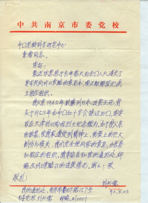 My father was taken to Japan in 1945 and was tortured to death there. His cremation, returned to China by China Red Cross, is placed in the Anti-Japanese Martyrs Memorial Park of Tianjin. My father’s victimization brought great material and spiritual trauma and losses to my family. I totally agree with your proposal and am willing to join the organization to be established. Please tell me your mailing address, postal code and progress of the claim for compensation in the reply letter. Thank you.