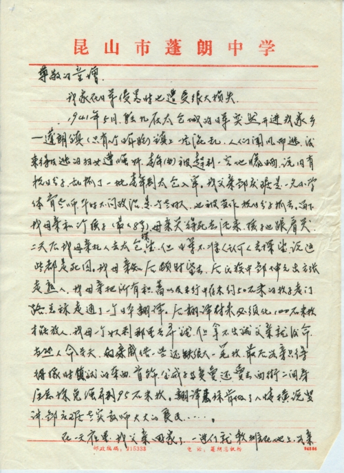 1941年5月,驻扎在太仓城的日军突然开进我家乡——蓬朗镇(只有几个日军驻)镇上一片混乱,人们闻风而逃,没来得及逃的妇女遭强奸,青年(幼)被赶到一空地曝晒,说内有抗日分子,乱抓了一批青年到太仓入牢。我父亲邹庆琚是一名小学体育老师,平时不问政治,是一个老好人。也被当作抗日分子抓去,留下我母亲个三个孩子(最大8岁)。母亲哭得死去活来,孩子也跟着哭。二天后我母亲托人去太仓探望。但日军不准任何人去探望,说这些都是死囚。我母亲知后顿时昏去,后氏族中邹坤元出主张走熟人。我母亲把所有积蓄以及米行中存米约50石米的款子走门路,总算走通了一个日本翻译。后翻译付来必须[花]100石米款才能放人,我母一个女人到那里去弄钱,但拿不出来钱父亲就没命,当然人命关天,向亲戚借一些,还缺很大一笔款,最后母亲只得将嫁时值钱的东西,首饰,金戒子等变卖,还卖去西街二间房屋,总算[勉]强弄到95石米款。翻译总算肯做了人情横说竖讲,邹庆琚老实教师大大的良民……。
