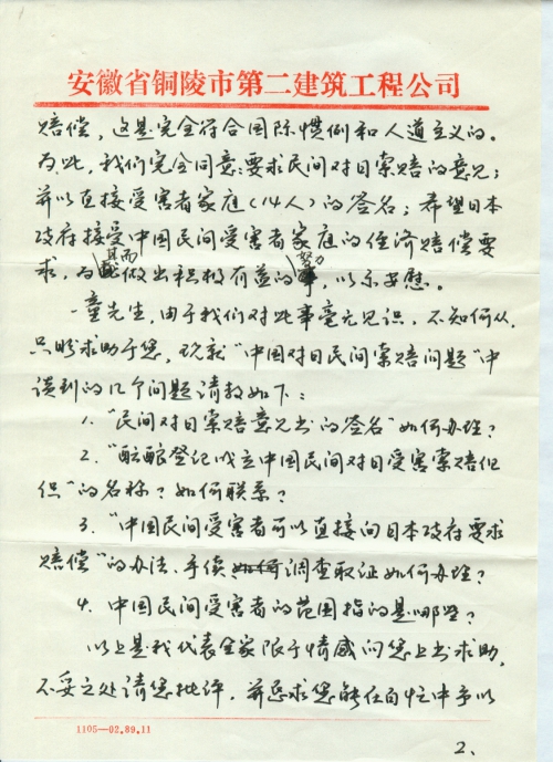 I recently read an article titled “Issues About China Demanding Civilian Compensation Against Japan” (See the attached copy) from Newspaper Abstracts of May 19, 1992. Before this, during the National People’s Congress in this March, Minister of Foreign Affairs Qian Qichen also answered questions related to the issue. I am so touched to know that you are working hard on it. I’d like to express gratitude to you.