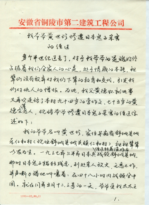 (Attached is a material about my grandfather Huang Shizhen being cruelly killed by Japanese soldiers.)