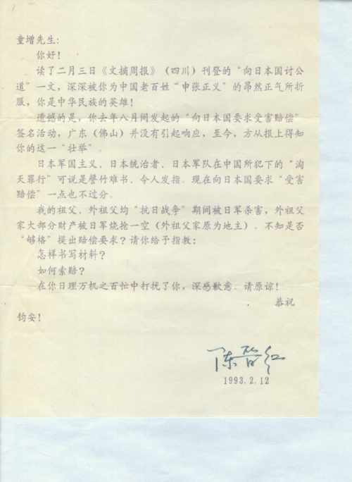 遗憾的是,你去年八月间发起的“向日本国要求受害赔偿”签名活动,广东(佛山)并没有引起响应,至今,方从报上得知你的这一“壮举”。