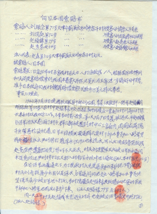 索赔要求:日寇侵华时,杀害我村居民4人,打伤致残1人。根据国际法惯例和民间受害赔偿原则,我国本着宽大为怀,化冤仇为玉帛,进一步搞好日中关系,准予日本政府向我村谢罪赔偿金额二十三万美元,特此奉告。