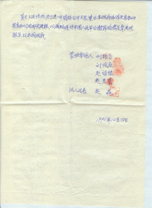 鉴于上述情况,为了进一步搞好日中关系,望日本政府体谅受害者的苦衷和今后邦交进程,以诚相待,对中国人民早日谢罪赔偿是幸。专此敬呈日本国政府。