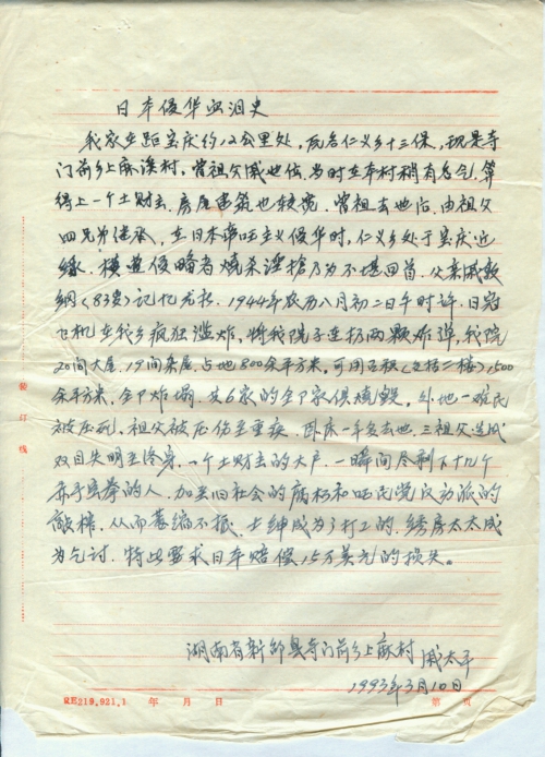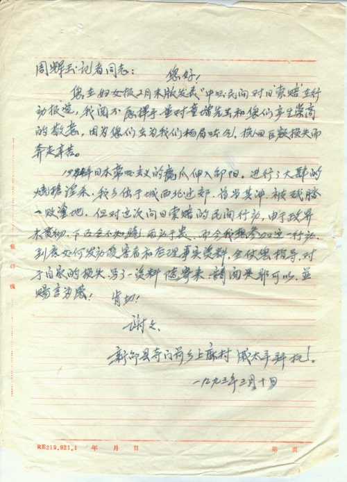 1944年日本帝国主义的魔爪伸入邵阳,进行了大肆的烧抢淫杀,我乡位于城西近郊,首当其冲,被残踏一败涂地,但对这次向日索赔的民间行动,由于政界未贯彻,下面全不知晓,无动于衷,而今,我想参加这一行动,到底如何发动受害者和整理事实资料,全仗您指导,对于自家的损失,写了一资料,随寄来,请阅是[否]可以,并赐言为感!
