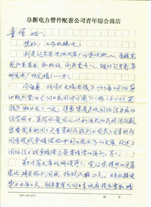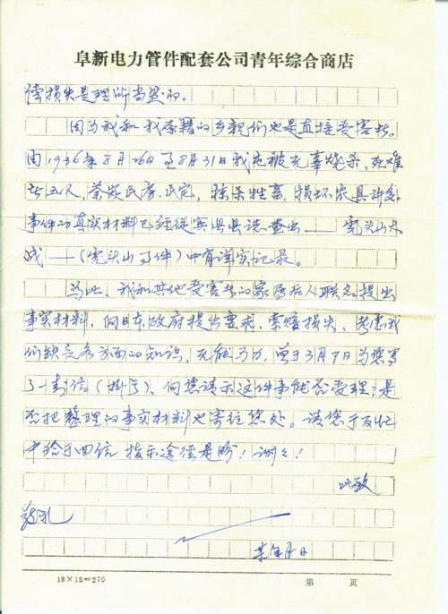 为此,我和其他受害者的家属后人联名提出事实材料,向日本政府提出要求,索赔损失,考虑我们缺乏各方面的知识,无能为力,曾于3月7日为您写了一封信(挂号),向您请示这件事能否受理?是否把整理的事实材料也寄往您处。请您于万忙中给[予]回信,指示途径是盼!谢谢!