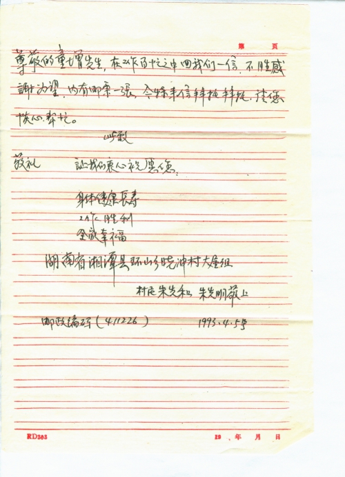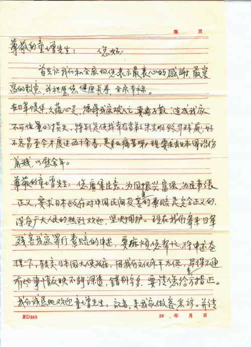 尊敬的童增先生:您广集民意,为国振兴富强,为民声张正义,要求日本政府对中国民间受害者的索赔是完全正义的,深受广大人民的热烈欢迎,坚决拥护。现在我们寄来日军残害我家罪行索赔的申述,要麻烦您帮忙,将申述整理一下,转交日本国大使政府,因我们文化水平太低,写得不通,有些事情反映不够深透,错别字多,要请您给多方指正。我们诚恳地欢迎童增先生,记者来我家做客采访。并请尊敬的童增先生,在工作百忙之中回我们一信,不胜感谢为望,内有邮票一张,今特来信拜托拜托,请您恢(“恢”编辑为“费”)心帮忙。