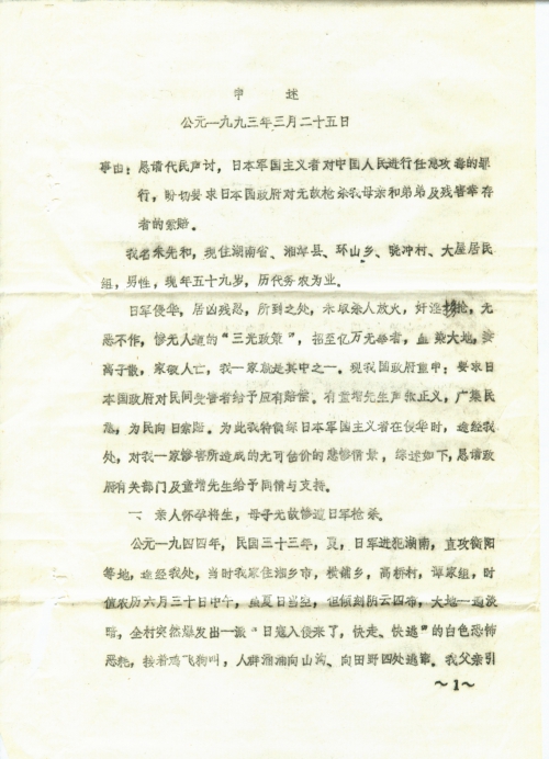日军侵华,居凶残忍,所到之处,采取杀人放火,奸淫掳抢,无恶不作,惨无人道的“三光政策”,招至亿万无辜者,血染大地,妻离子散,家破人亡,我一家就是其中之一。现我国政府重申:要求日本国政府对民间受害者给予应有赔偿。有童增先生伸张正义,广集民怨,为民向日索赔。为此我特简综日本军国主义者在侵华时,途经我处,对我一家惨害所造成的无可估价的悲惨情景,综述如下,恳请政府有关部门及童增先生给予同情与支持。