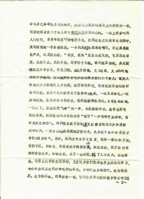 公元一九四四年,民国三十三年,夏,日军进犯湖南,直攻衡阳等地,途经我处,当时我家住在湘乡市,横铺乡,高桥村,谭家组,时值农历六月三十日中午,虽夏日当空,但[顷]刻阴云四布,大地一遍淡暗,全村突然爆发出一派“日寇入侵来了,快走,快逃”的白色恐怖恶耗,接着鸡飞狗跳,人群涌涌向山沟、向田野四处逃窜。我父亲引着我身已怀孕九个月的妈妈,抱着刚满两岁的弟弟及我等姐妹一家,随着近邻乡亲二十多人匆忙踉跄地直奔深林山坳,一路上喊爹叫妈人心惶惶。弟弟年幼直吓得啼哭不休,我妈在极度痛苦与恐惧中,无可奈何地一手紧按肚腹,一手死死捂住弟弟的嘴巴,不让弟弟哭出声来。心里默念着:“救苦、救难”总望安度灾殃。可万恶的日军,无获不止,无处不侵,恶梦终于实现,瞬间魔掌出现,身无披遮的五六个日军,手执刀枪,呲牙咧嘴,又吆喝、又吼叫地四面步步逼进,在山坳中紧紧包围着我等乡亲们二十多人,毫无人性地对女乡亲进行人身侮辱,进行轮行奸污。我母无法忍受这群野兽的欺凌,最后只能紧搂着弟弟置怀中吮奶,一边哀求挣扎,一边拼命拒绝,总想求得日军同情。谁料饿狼哪有慈心,日军兽欲未遂,一怒之下,振动机枪“呯”的一声,母亲胸部中弹,撒手丢开吃奶的弟弟,随同腹内九个月的孩子“哎呀”一声仰卧于血泊中。当时尚未立即咽气,妈妈嘴里尚不住地迸发出凄凉的怨恨声和悲惨的呻吟声,一直由山坳痛滚到坳下稻田里,先后近十多分钟左右才含愤瞪目断气。是时,我妈才年方三十五岁。我等一家心如刀绞,肝肠寸裂。目睹着、耳闻者无不掩面惊呼,泪湿衣襟。而万恶的日军却旁若无事,哈哈大笑,抢了一些东西,掳了几个民夫,扬长而去。我等正处于极度悲愤中,又发现乡亲们抱着全身血淋淋的弟弟,半小时前还正在妈怀中吃奶的弟弟,乡亲们在为他惊叹,在为他抚慰,在为他擦血。我等奔前一看,可怜的弟弟也同时被子弹击中腮部下额,将他的舌头、牙齿、面部击开了,鲜血染红了全身,脸色苍白,人事不省。一家人沉浸在号天呼地、哭娘、哭弟、哭命之中,就是铁石心肠之人见了也得动情。“日寇:你们怎么如此狠心”,当时由于天气酷热,数时后,血醒(“醒”编辑不“腥”)气味飘荡山岗,吸引着许多蚂蚁成群而至,像万恶的日军一样舐吸着妈妈与弟弟的鲜血,当时的情景实实目不忍睹。奄奄一息的弟弟还多亏近邻彭福胜之儿媳就地找来一个盘箕,掩盖着弟弟的身子;乡亲们就地找来一些封血镇痛的草药,撕下一些破布进行包扎,才使九死一生的弟弟复活存世。