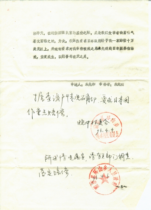“一家遭难,千家不平,国仇家恨久蕴心灵”。论赔偿吧,实在无法估算,我一家精神、物质上、特别是人身上损失极重,恨不得一口怒吞凶暴者的肉,喝残害者的血,才解心头之恨,但事以(“以”编辑为“已”)至此,无法昨天,在迎接国强民富的盛世之际,正是我们受害者扬眉吐气曙光面临之时,为此,我强烈要求日本政府给予我一家赔偿十万美元以上,并迫切要求对我幸存被残之弟朱先明赴日本国养伤治残,安度残生,以慰吾母在天之灵。