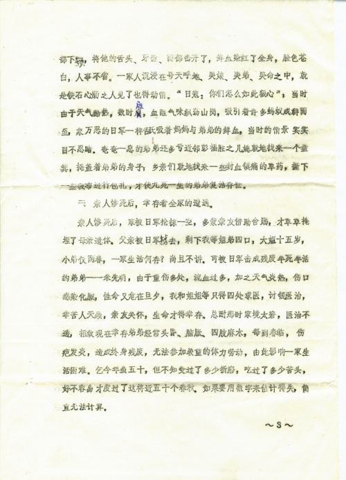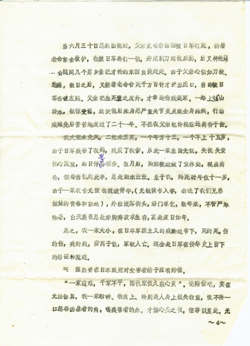 The cruel invading Japanese army implemented the Three Alls Policy wherever they went by killing, burning, plundering and raping, causing the death of millions of innocent people and breaking many families apart. My family was one of them. Our government has restated that the Japanese government should duly compensate civilian victims. Besides, Mr. Tong Zeng is working on gathering information of victims, pursuing justice for them and demanding compensation against Japan for them. Therefore, we will describe below the immeasurable losses the Japanese militarist caused to my family during the war. We sincerely ask for sympathy and support from relevant government departments and Mr. Tong Zeng.