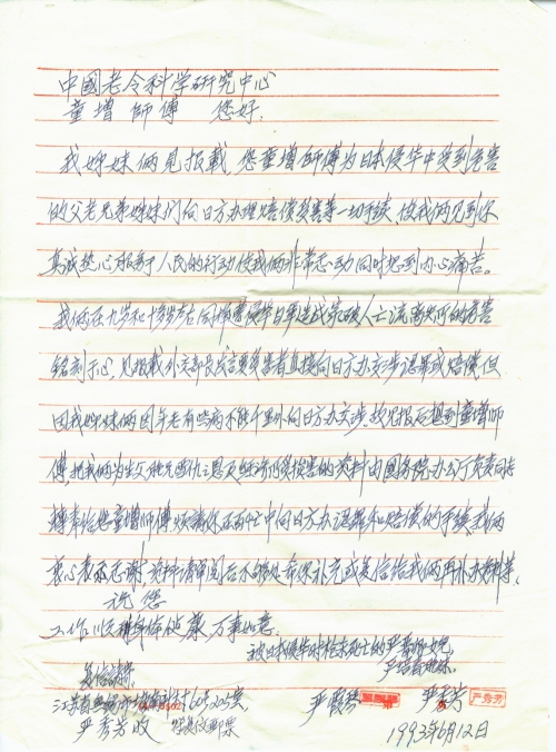We sisters learned from the newspaper that you are handling compensation procedures for victims of Japan’s war of aggression against China. We are so touched by our sincere and enthusiastic services for the people. Meanwhile, it reminds us of painful memories. When we were 9 and 10 respectively, my family was broken apart by the invading Japanese army. The newspaper says the Minister of Foreign Affairs asks the victims to directly demand apologies and compensation against the Japanese government, but we are unable to do that due to our age and health. So we sent materials about our father’s and elder brother’s death and my family’s economic losses to the Principal of the General Office of State Council and asked him/her to forward the materials to you. Mr. Tong, please take time to handle our compensation procedures. We really appreciate it. If the materials are not enough, please make a supplement or reply to us so we can provide supplementary materials.