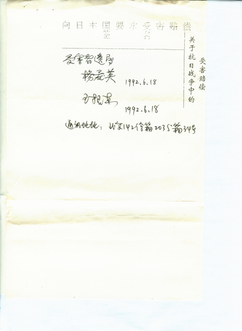 签在上面的杨爱英是我的母亲,现身患肺癌,卧病在床,她对日本鬼子相当愤恨,对日本政府最近决定派兵出去,非常气愤。民间索赔,可以阻止它这个军国主义复活的先兆。