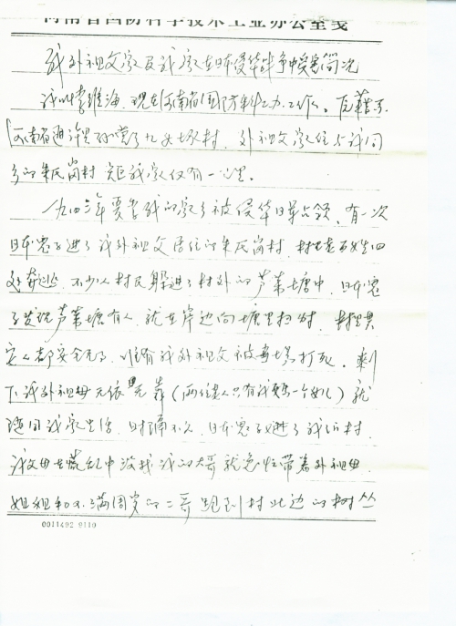 一九四三年夏季,我的家乡被侵华日军占领,有一次日本鬼子进了我外祖父居住的朱氏岗村,村里百姓四处奔逃,不少人村民躲进了村外的芦苇塘中。日本鬼子发现芦苇塘有人,就在岸边向塘里扫射。村里其它人都安全无事,唯有我外祖父被当场打死。剩下我外祖母无依无靠(两位老人只有我妈一个女儿)就随同我家生活。时隔不久,日本鬼子又进了我们村,我父母在慌乱中没找我的大哥就急忙带着外祖母、姐姐和不满周岁的二哥跑到村北边的树丛中躲藏。不幸被两个骑马的日本兵发现,强迫我父亲给他们牵马带路。当时把我只有几岁的姐姐吓哭了,外祖母就不停地哄劝我姐姐不要哭。其中一个日本兵就向我外祖母开了一枪,击中大腿部位。(事后我父母回忆说,可能日本兵以为外祖母在骂他们)打伤了外祖母后,在妈妈姐姐和哥哥他们一片哭叫声中,日本鬼子还是强迫我父亲给他们带路走了。日本鬼子真是惨无人性呀!为给外祖母医治枪伤,把外祖母家的30多亩土地和房产、宅基地都卖光了,又卖了我家部分土地。因当时兵荒马乱,谁也无心购置房产、土地,最后托人说情,买主才勉强买下了。但价格低得可怜,加之当[时]医疗条件落后,外祖母终因枪伤感染,受尽了疼痛的折磨含恨死去。