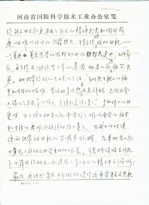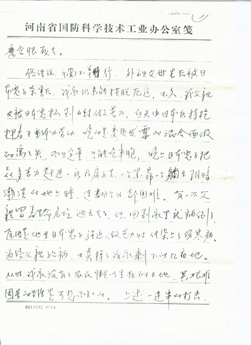 俗语说:祸不单行。外祖父母先后被日本鬼子杀害后,我家仍未能摆脱厄运。不久,我父亲又被日本鬼抓到开封做苦力。白天由日本兵持枪押着干重体力劳动,吃的是变质发霉的混合面做的窝窝头,而且定量,只能吃半饱。晚上日本鬼子把众多苦力赶进一所大房子里,一个紧靠一个躺在阴暗潮湿的地上睡,连翻个身都困难。有一次父亲冒着生命危险逃出去了,但回到家里就病倒了。原因是他在日本鬼子强迫做苦力时传染上了伤寒病,为给父亲治病,又卖掉了我家剩下的几亩地。从此,我家没有了农民[赖]以生存的土地,其艰难困苦的生活是可想而知的。上述一连串的打击,给我父母及家庭造成了巨大的精神打击和肉体折磨以及难以估计的经济损失,特别是对我的母亲——一个普通、善良、忠厚的农村妇女的打击更大,几十年后,每当提及上述这些不幸的遭遇她老人家还痛哭失声。她经常给我们兄妹几个讲:“当时失去亲人的痛苦和生活的艰难,曾使她多次想自杀来解脱。正因为舍不得几个未成年的孩子,才挣扎着活下来了”。多么伟大的母爱呀。为了孩子她老人家承受住了难以承受的痛苦和生活的磨难而顽强的活下来了。在我小的时候,夜间经常被母亲的哭喊声惊醒,原来她老人家又梦见了外祖父母受害时的场景。可见日本侵略者所犯下的罪行给她老人家造成了多么巨大的精神创伤啊!