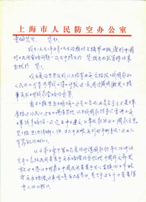 我在一九九二年五月十九日的报刊文摘第四版,读到中国对日民间索赔问题一事,文中提及于您,故也就冒昧的来打扰于您了。