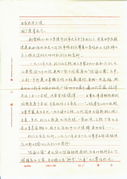经与家人回忆,我们向日本驻中国大使馆写出了财产索赔信函,同时给您寄来一份,因为不知如何书写,也不知这样可不可以,望您在百忙中予以回信指正。我想待您回信后,再次向日驻华大使馆寄去索赔信函。