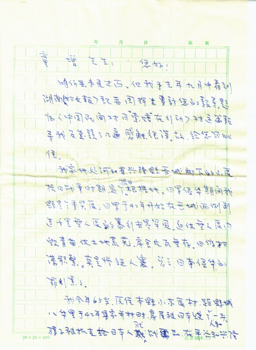 咱们虽未见过面,但我是去年九月中看到湖南《妇女报》记者周辉玉专访您的报道。题为《中国民间对日“索赔”在行动》对这篇报道我反复读了几遍,感触很深。故,给您写此信。