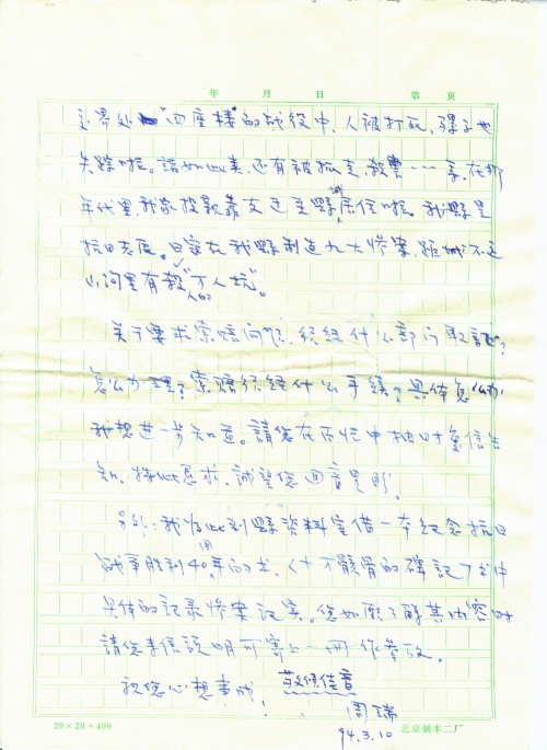 另外:我为此到县资料室借一本纪念抗日战争胜利40周年的书,《十万骸骨的碑记》书中具体的记录惨案纪实。您如愿了解其内容时,请您来信说明可寄上一册作参照。