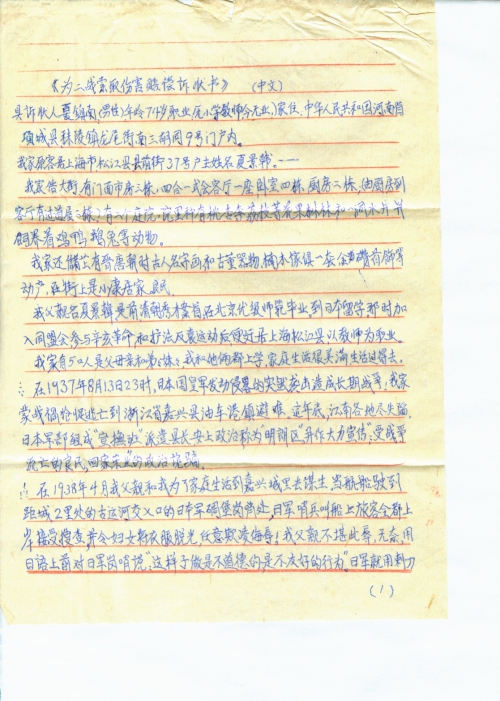 尊敬的阁下:为了中日友好永世和平,与为了年届耄耋,无所依俈的难民恳请偿付二战伤害赔偿米国金币十万元,(即付:USA.$100000#)并祝工作顺利