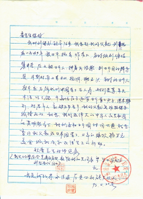 细节:我是刘继民,父亲刘荣振在1942年被日军抓去做劳工,每天挖山洞,要求日本赔偿。信中有村委盖章证明。