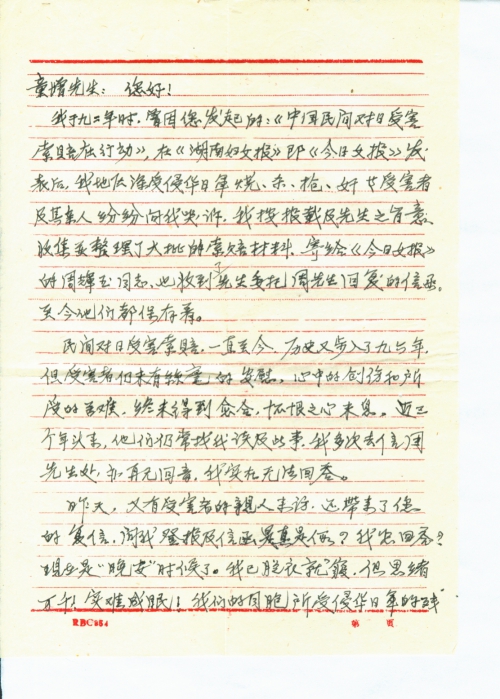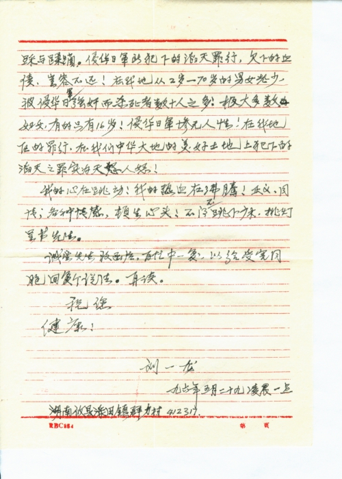 昨天,又有受害者的亲人来访,还带来了您的复信,问我登报即信函是真是伪?我怎回答?现在是“晚安”时候了。我已脱衣就寝,但思绪万千!实难成眠!我们的同胞所受侵华日军的残踩于蹂躏。侵华日军所犯下的滔天罪行,欠下的血债,岂容不还!在我地从2岁-70岁的男女老少,被侵华日军强奸而杀死者数十人之多!极大多数为妇女,有的只有16岁!侵华日军惨无人性!在我地区的罪行,在我们中华大地的美好土地上犯下的滔天之罪实为天怒人怒!