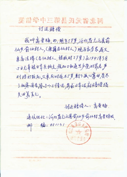 我叫高爱梅,女,现年58岁,河北省元氏县前仙乡,前仙村人,(原籍后仙村人)现在家务农。我父亲高法瑞(后仙村人,被抓时27岁)在1941年3月5日无辜被日本兵抓走,强加上私通共产党的罪名,严刑拷打致死。父亲死时我才5岁,剩下孤儿寡母,受尽了饥寒困苦。鉴于以上情况,要求日本政府赔偿损失四万美元。