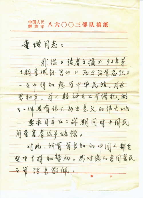 我从《读者文摘》92年第十期李佩钰写的《历史没有忘记》一文中得知您为中华民族,为世界和平,为人类神圣不可侵犯,做了一件具有伟大历史意义的伟大工作——要求日本在二战期间对中国民间受害者给予赔偿。