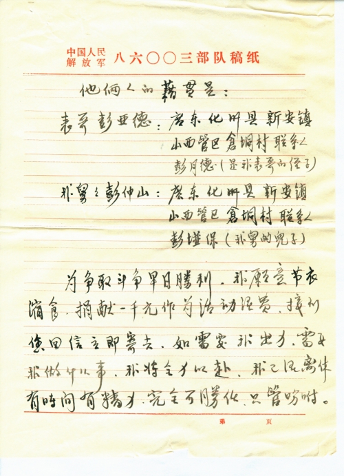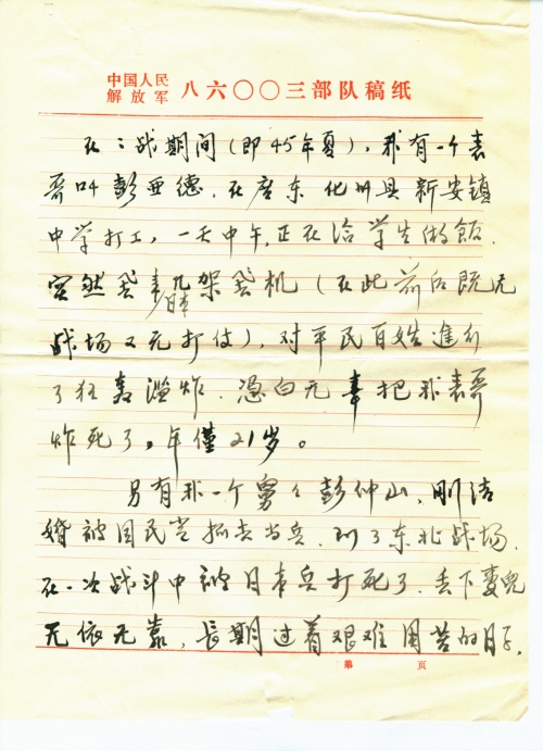 另有我一个舅舅彭仲山,刚结婚被国民党抓去当兵。到了东北战场,在一次战斗中被日本兵打死了,丢下妻儿无依无靠,长期过着艰难困苦的日子。