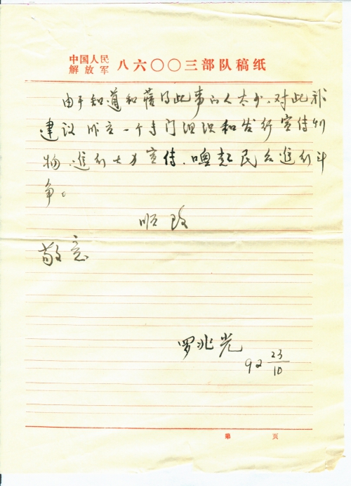 为争取斗争早日胜利,我愿意节衣缩食,捐献一千元作为生活经费,接到您回信立即寄去。如需要我出力,需要我做什么事,我将全力以赴,我已经离休,有时间有精力,完全可胜任,只管吩咐。