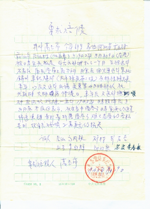 我叫高玉亭,今年69岁,家住河北省元氏县前仙乡后仙林(仙翁寨)于1942年8月初9日(农历)被日本宪兵抓走,到元氏县城住了一个月,后被送到石家庄,南兵营劳工教习所,月余后用火车运到东北锦州埠新煤矿(太平采炭第二坑)在那里采煤半年,以后又运到北满关东军4838部队,在兴凯湖大湖岗修港口,半年后,又送到抚顺矿龙风坎挖煤,一直到1945年,日本投降后于8月底采返回家乡。在这当中受尽了日本宪兵的迫害,惨遭冻饿毒打等折磨,受尽了难及忍受的各种酷刑,故要求赔偿2万美元的损失。