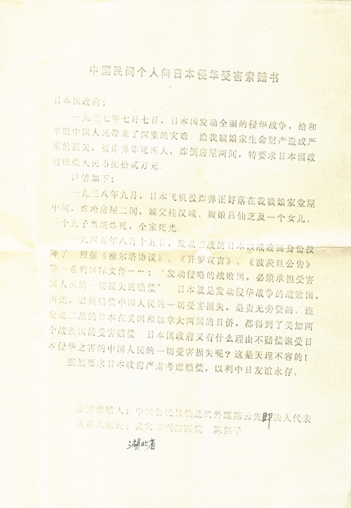 一九三七年七月七日,日本国发动全面的侵华战争,给和平的中国人民带来了深重的灾难,给我姨娘家生命财产造成严重的损失,被炸弹炸死四人,炸倒房屋两间,特要求日本国政府赔偿人民币捌拾贰万元。