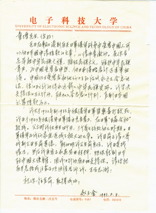 我父于1932年到1933年被侵华日军监禁毒打致死,我母于1942年被侵华日军强迫充当童工,在日军“亚麻会社”致残。父亡时我仅出生四个月,三个哥哥均处幼儿时期。日军侵华为我们家庭造成了极大的不幸。我目前正请二哥找到父母生前遗像,能证明我父生前身份,我母受残情况,然后我再实事求是写出材料,烦你转到日本驻中国大使馆,用我的行动有力地支持你。请你把有关表格或主义事项回信告诉我,万分感谢!