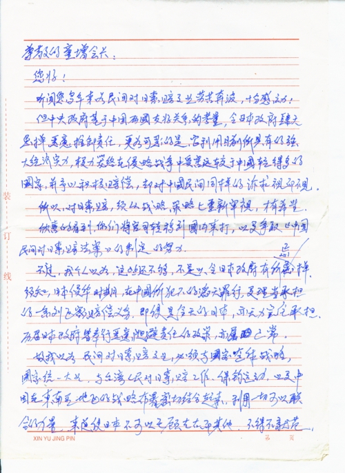 细节:听闻您多年为对日索赔奔波,很感动,支持日索赔。备注:信是通过倪元茂寄来的。