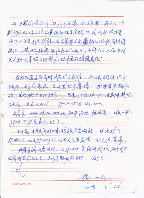 我不知您是否有时间看到这封信,加上我文字组织水平有限,更多的想法,在这里权且省略,如果有兴趣的话,希望拨冗与我联系,我是一个流浪汉,无具体地址及电话,只有email:yywa115@163.com 或者查www.china.com.cn和平论坛,祖国统一(统一策)yywa115所发表的帖子。