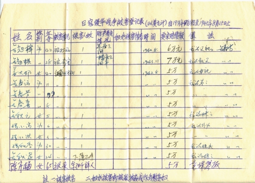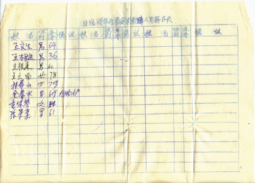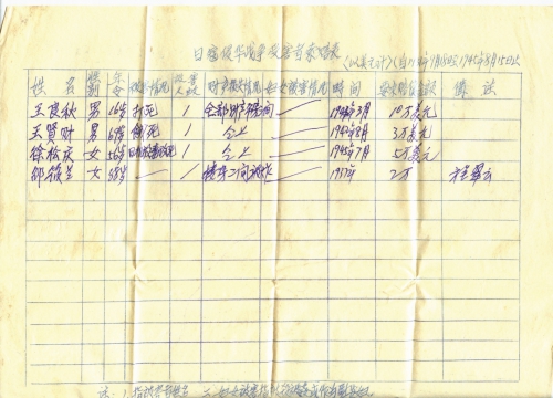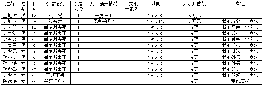 细节:方乃文寄来在日本侵华期间金华市受害者索赔表,有王良秋等人被残害,孙小洪等人1942年8月被细菌战害死,徐松庆1945年7月被毒气弹熏死,邹筱兰家房屋在1937年被日军炸毁。