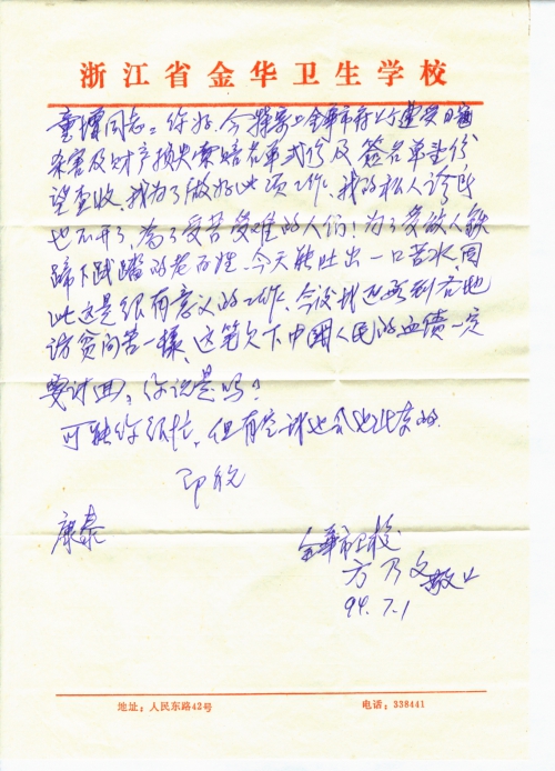 今特寄上金华市府上个遭受日寇杀害及财产损失索赔名单二份及签名单一份望查收。我为了做好此项工作,我的私人诊所也不开了,为了受苦受难的人们!为了受敌人铁蹄下践踏的老百姓,今天能吐出一口苦水,因此这是很有意义的工作,今后我还要到各地访贫问苦一样,这笔欠下中国人民的血债一定要讨回!你说是吗?