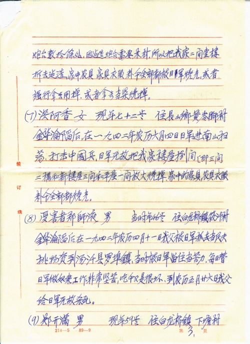 (22)俞奶家有楼屋三间,在金华沦陷后,在一九四二年农历五月时,日军无故将我家楼屋(沙汘村)三间放火烧掉,家中的家具、农具、粮食、衣服也都被日军全部烧光。损失巨大。