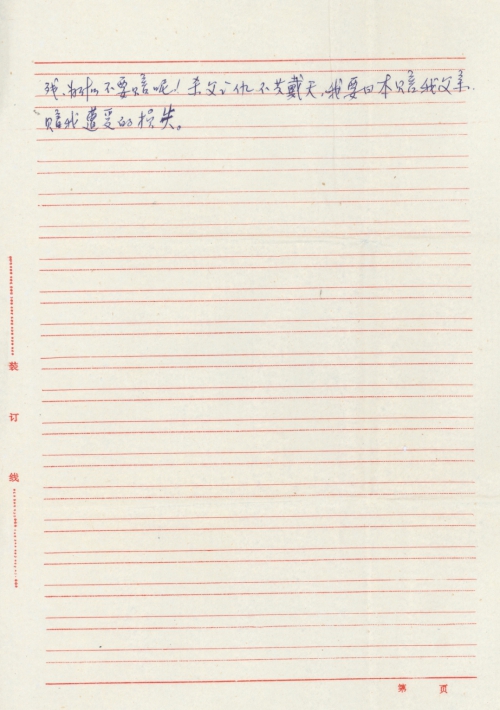 来信早已收到了,我非常感激您,为我也为全体受苦难的中国同胞伸张了正义,说出了心里话。我想,日本人到中国来旅游,死于车祸的,却要我们赔很多钱。而日本鬼子扛着枪,到中国来,把中国人民抓去,任意杀掉,为什么不要赔呢!所以如果有必要,我愿带了我75岁的老母亲到北京,日本大使馆门口静坐……。