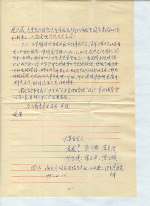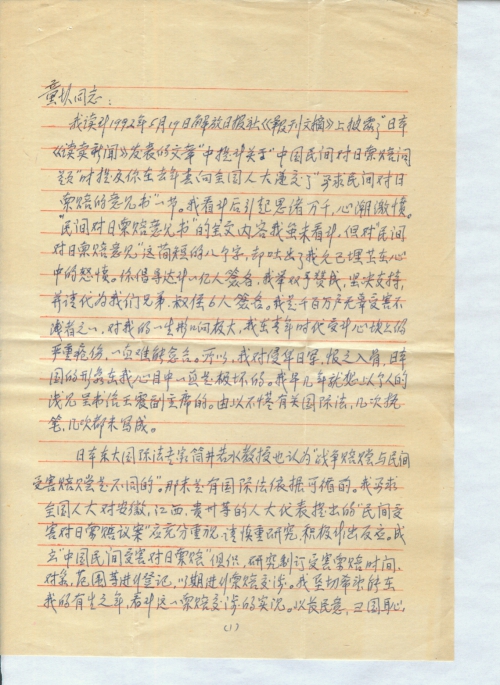 我读到1992年5月19日解放日报社《报刊文摘》上披露了“日本《读卖新闻》发表的文章”中提到关于“中国民间对日索赔问题”时提及你在去年曾向全国人大递交了“要求民间对日索赔意见书”一节。我看到后引起思绪万千,心潮激愤。“民间对日索赔意见书”的全文内容我虽未看到,但对“民间对日索赔意见”这简短的八个字,却吐出了我久已埋藏在心中的怒愤。你倡导达到一亿人签名,我举双手赞成,坚决支持,并请代为我们兄弟叔侄6人签名。我是千百万户无辜受害不浅者之一,对我的一生影响极大,我在青年时代受到心坎上的严重创伤,一直难能愈合。所以,我对侵华日军,恨之入骨,日本国的形象在我心目中一直是极坏的。我早几年就想以个人的浅见呈书给王震副主席。由于不懂有关国际法,几次执笔,几次都未写成。