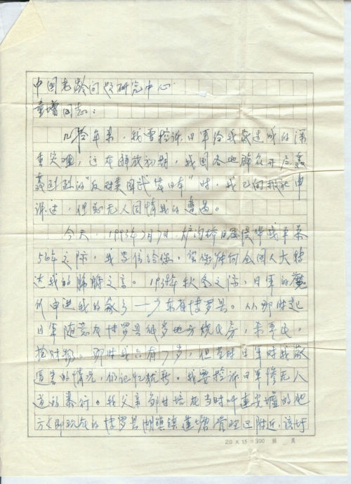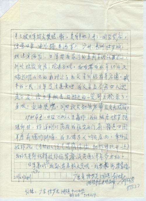 今天,1993年7月7日,[卢]沟桥日寇侵华战争毕56年之际,我写信给您,望您能向全国人大转达我的肺腑之言。1938年秋冬之际,日军的魔爪[伸]进我的家乡——广东省博罗县。从那时起,日军随意在博罗县很多地方烧民房,杀平民,抢财物。那时我只有7岁,但当时日军对我家逼害的情况,仍记忆犹新。我要控诉日军惨无人道的暴行。我父亲邹甘培在当时叫连安墟的地方(即现在的博罗县湖镇镇莲塘管理区附近,该圩早已被日军放火焚烧,渐渐变成平地)开了一间杂货店,经营日杂,油盐糖米酒等。广州、惠州、博罗城相继沦陷后,日军在我家乡的显岗车桥驻扎,到处烧毁民居,抢劫百姓。我母带我们年幼的兄妹逃难山区的小村上,我父亲则仍看守店铺。秋来的一天,日军走去连安圩,我父亲及邻居四人逃走不及,给日军抓去,在附近的一荒野上枪杀了,并淋上电油焚烧。同时放火把我店铺及民居烧毁。