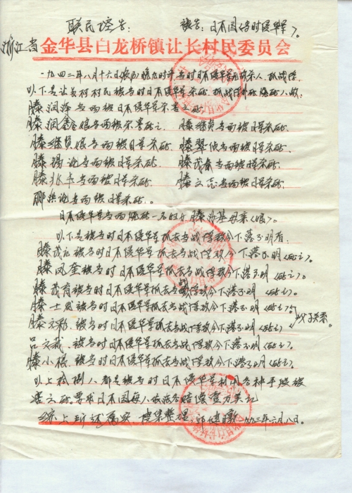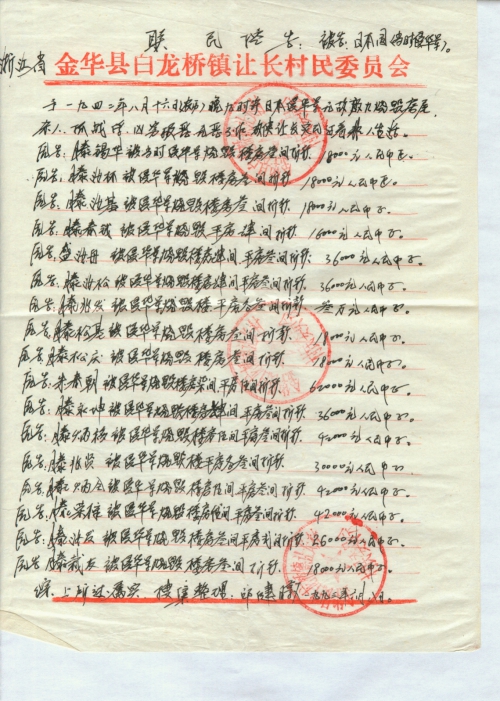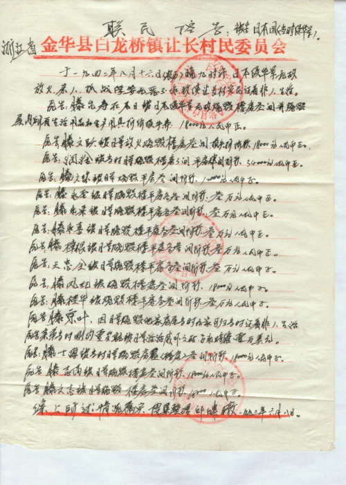 一九四二年八月十六日(农历)晚九时许当时日本侵华军无故放火、杀人、抓战俘,穷凶极恶、无恶不作,放火烧毁浙江省金华县白龙桥镇,让长村村民公用房子,放火烧毁前厅楼房九间,损失价值折款六万三千元人民币整,平房六间,损失价值折款三万六千元人民币整。
