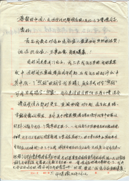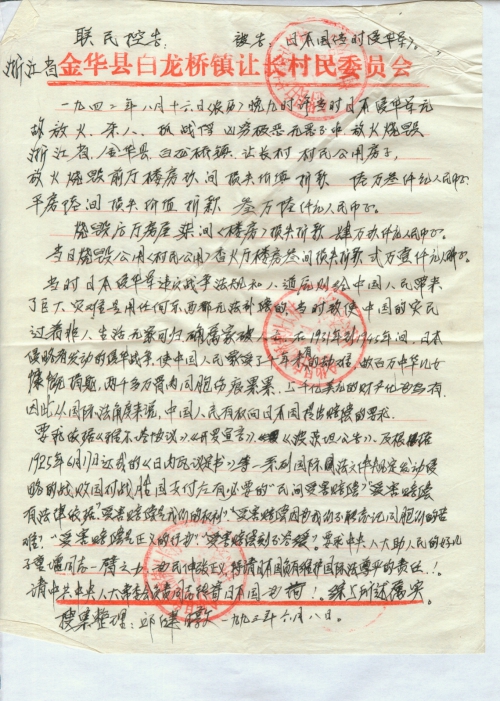 Besides, I’ll provide a brief report on the evidence of the Japanese army’s crimes during Japan’s war of aggression against China. I plan to do my best to help you until you win the (compensation) cause. I’ve walked over 10,000 kilometers to collect evidence at my own cost. In fact, I’ve spent nearly 1,000 yuan and I am having some economic difficulties. But I am determined to collect evidence from all victims of the entire Jinhua County. The victims’ suffering is my suffering and the people’s happiness is also mine. I will devote all I have to the people. Comrade Tong Zeng, please help me and I will not make you suffer losses. Please understand what I mean.
