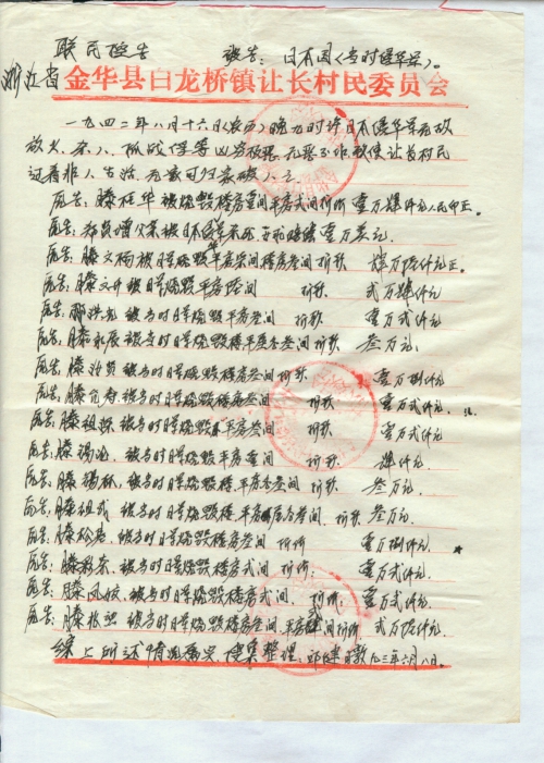 At about 9 pm on lunar August 16, 1942, the then invading Japanese army committed horrible crimes including arson, murder and capturing war prisoners. They burned public houses of the villagers in Rangchang Village, Bailongqiao, Jinhua, Zhejiang, including 9 front buildings worth RMB 63,000, 6 bungalows worth RMB 36,000, 7 back buildings worth RMB 49,000 and 3 public incense halls (buildings) worth RMB 21,000.